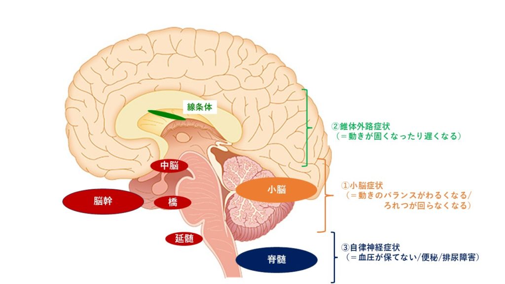発症機序は、グリア細胞(神経細胞を支持する細胞)にαシヌクレインという蛋白が蓄積することにより、これらの神経系が機能しなくなり発症することがわかってきています。