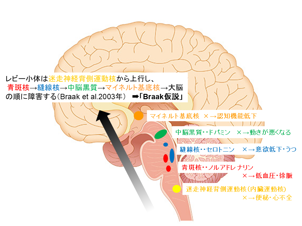 しかし近年、レビー小体の進展は中脳黒質に発現する前に、延髄の迷走神経背側運動核に始まり、脳幹を上行して青斑核(せいはんかく)→縫線核(ほうせんかく)→中脳黒質に上行していくことが明らかになりました(Braakら. 2003年)。